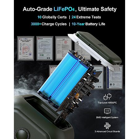 - Battery & Safety: LiFePO4 (LFP) cells; 13 certifications (FCC, UL, CE, ROHS, PSE, UN38.3, etc.); advanced BMS with 12 protections (real-time voltage/current/temp monitoring).
