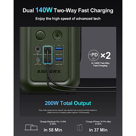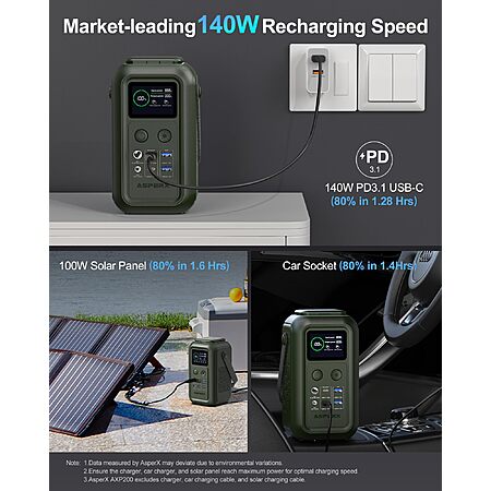 192Wh AsperX Portable 4-Port USB Power Station, up to 200W Total, 140W USB-C (AXP200, Green) on sale for $139.99 - 50% with promo code