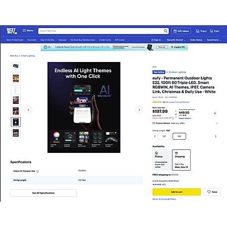 Best Buy: eufy - Permanent Outdoor Lights E22, 100ft 60 Triple‑LED, Smart RGBWW, AI Themes, IP67, Camera Link, Christmas & Daily Use - White $197.99