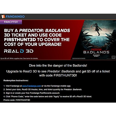 6. Your ability to receive $5 off a Predator: Badlands RealD 3D ticket will expire on 11/16/25, or when the limit of promo code redemptions is reached, or when Predator: Badlands is no longer available in RealD 3D theaters, whichever comes first.