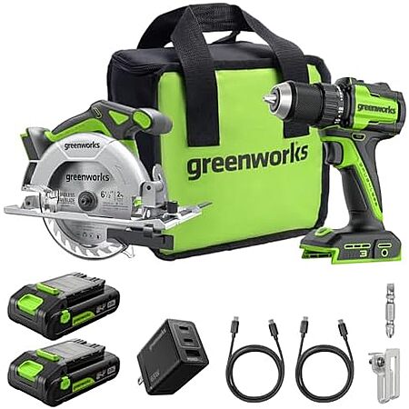 $139.99: 2-Piece Greenworks 24V Cordless Brushless Combo: 400 in-lbs Drill/Driver + 6.5" Circular Saw (2×2Ah USB-C Batteries) & More at Amazon