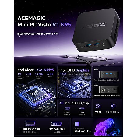 ACEMAGICIAN Vista V1 Mini PC: N95, 16GB DDR4, 512GB SSD $170.99