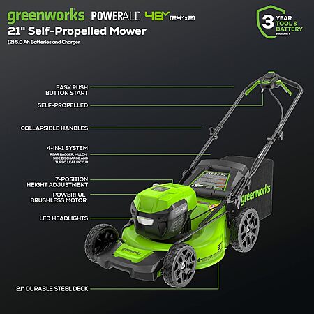 Amazon.com has Greenworks 48V (24V x 2) 21" Brushless Self-Propelled Mower+12" String Trimmer+320CFM Blower,(2) 5.0Ah Batteries and 4A Dual Port Charger on sale for $409.99.