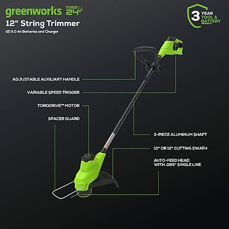 - String Trimmer Highlights: This string trimmer features a 12-inch cutting path and a brushed motor. The 0.065" cutting line and Auto Feed system enhance its functionality. It is reliable and covered by a 3-year warranty.