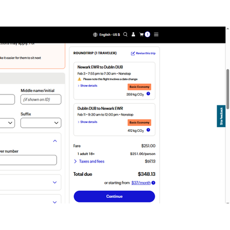 United Airlines have round trip airfares travelling from New Jersey (EWR) to Dublin Ireland (DUB) for $349, nonstop. These are basic economy fares that allow a personal item and a carry-on bag. There is no seat selection and no change. If you are travelling with children, you will be seated together as per UA's policy.