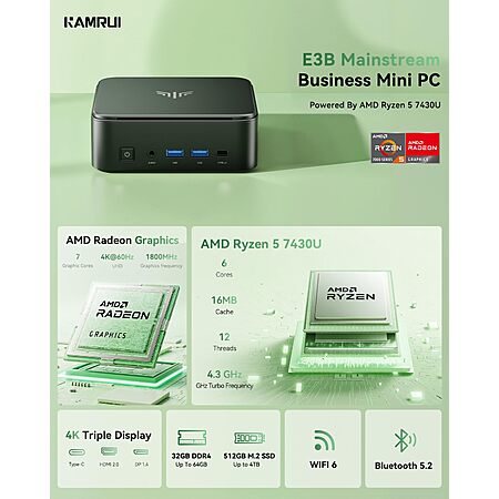 Prime: KAMRUI E3B Mini PC: Ryzen 5 7430U, 32GB DDR4, 512GB SSD, Wi-Fi 6, BT 5.2 $263.99