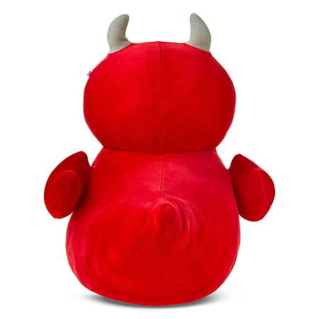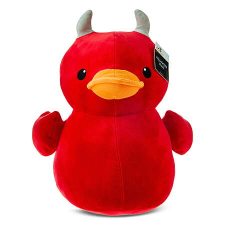 Way To Celebrate Halloween Devil Quackerz Duck Large Plush Toy. Bright red plush with soft gray devil horns. Features an orange duck bill and classic Quackerz shape. Oversized and huggably soft for spooky cuddles. Fun Halloween décor or gift for plush collectors.