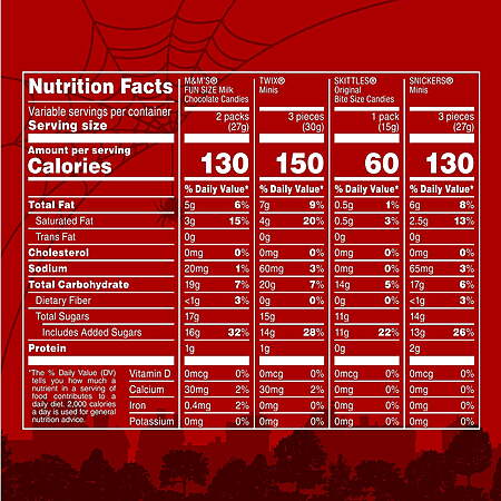 Contains one (1) 24.01-ounce, 60-count bulk variety bag filled with Mars Mixed M&M'S Milk Chocolate, SNICKERS, SKITTLES Original & TWIX Fun Size and Minis Halloween Candy
