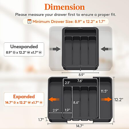 - Adjustable Design: This utensil drawer organizer is designed to be adjustable, accommodating various drawer sizes and shapes. When folded, it measures 8.3" x 12.2" x 1.7", and when unfolded, it extends to 14.7" x 12.2" x 1.7". The buckle design allows for smooth sliding and easy adjustment, preventing the dividers from slipping out of place.