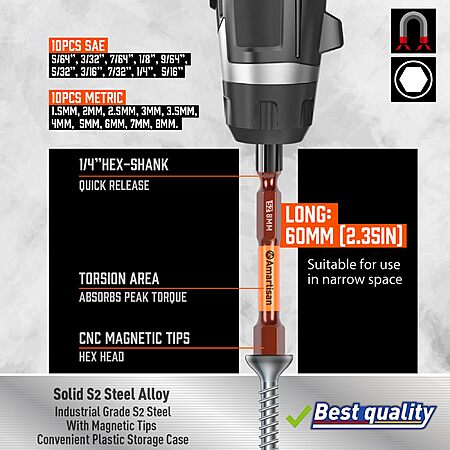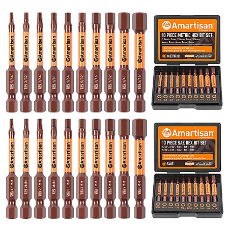 20-Piece Amartisan Hex Head Allen Wrench Drill Bit Set, Metric and SAE S2 Steel Hex Bits Set, Magnetic Tips, 2.3" w/ Storage Box $8.99 + Free S/H w/ Prime or on $35+