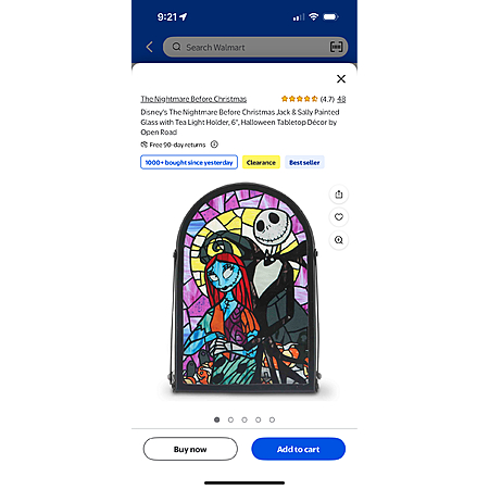 Let your love for Halloween Town shine with this Disney The Nightmare Before Christmas Jack and Sally Painted Glass Tea Light Holder. Styled like a gothic cathedral window, this 6-inch décor piece features vivid stained-glass style artwork of Jack Skellington and Sally surrounded by glowing purple, yellow, and pumpkin orange hues. Add a tea light behind the glass to watch the flickering candlelight cast eerie shadows, bringing their ghostly romance to life in true Tim Burton style. The sturdy metal easel back allows for stable tabletop, mantel, or shelf display, making it easy to add spooky ambiance anywhere. Perfect for Halloween parties, haunted house vibes, or year-round gothic décor, this piece captures the hauntingly beautiful love story of Jack and Sally. A must-have for Disney fans, it's a glowing tribute to The Nightmare Before Christmas and the spirit of Halloween.