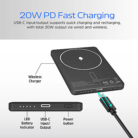 Energizer - 5,000mAh SLIM METAL 20W Magnetic Wireless Qi/Qi2.0/MagSafe PowerBank, Portable Charger, 2 Outputs, LED Display, & USB-C - Black $12.99