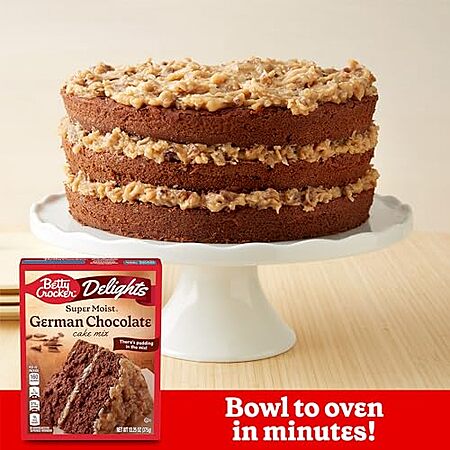 [S&S] $10.72: 12-Pack 13.25-Oz Betty Crocker Delights Super Moist German Chocolate Cake Mix at Amazon (89.3¢ each)