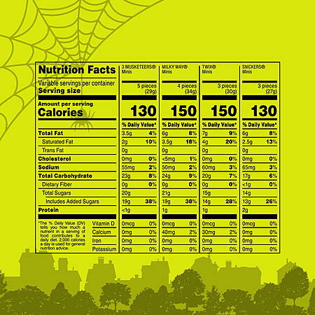 | Product Description: | Get ready for a hauntingly delicious Treat Season with this Mars Mixed SNICKERS, TWIX, MILKY WAY & 3 MUSKETEERS Milk Chocolate Minis Halloween Candy Bag. Stock up on this variety pack for your Halloween candy buffets, party favors, boo bags, and other Treat Season activities. Whether you're filling candy cauldrons, treating yourself, or sharing with friends around a bonfire, this bulk bag has something for everyone to enjoy. Perfect for adding a spooky touch to your office break room, these devilishly delicious minis will have your coworkers eagerly sinking their teeth into them. Your neighborhood ghouls and goblins will be lining up around the block when they see your candy cauldron filled with these Halloween treats. Add our Mars Mixed SNICKERS, TWIX, MILKY WAY & 3 MUSKETEERS Milk Chocolate Minis Halloween Candy Bag to your cart today! Contains one (1) 8.57-ounce, 30-count bulk variety bag of Mars Mixed SNICKERS, TWIX, MILKY WAY & 3 MUSKETEERS Milk Chocolate Minis Halloween Candy Enjoy the spooktacular flavors of Treat Season with this thrilling combination of peanuts, gooey caramel, nougat, and velvety milk chocolate found in this Halloween candy bar assortment This 30-count bulk bag contains a spooky assortment of individually wrapped miniature milk chocolate bars that's perfect for trick-or-treating or sharing at Halloween parties Pass around a candy bowl filled with SNICKERS, TWIX, MILKY WAY, and 3 MUSKETEERS chocolate bars as you cozy up for a Halloween scary movie marathon Fill your office candy cauldron with this bewitching assortment of Mars Mixed SNICKERS, TWIX, MILKY WAY, and 3 MUSKETEERS Halloween milk chocolates Feature Benefits not yet available. Coming Soon! |