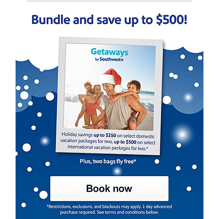 Book a vacation for 2 people on Southwest Vacations and get up to $250 off select domestic vacation packages or Up to $500 off select international vacation packages, plus 2 bags fly free and earn 5x Rapid Rewards points.