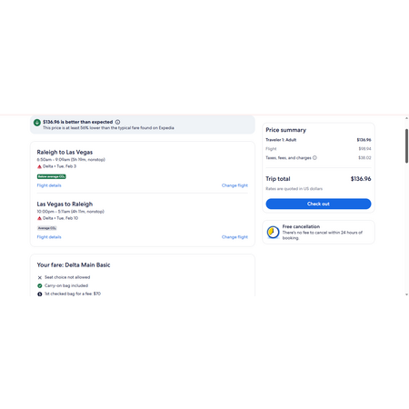 Delta Air Lines, Southwest Airlines and Expedia have round trip airfares travelling to and from Raleigh NC (RDU) and Las Vegas (LAS) for $137, nonstop. These are basic economy fares that allow a personal item and a carry-on bag. There is no seat selection and no change.