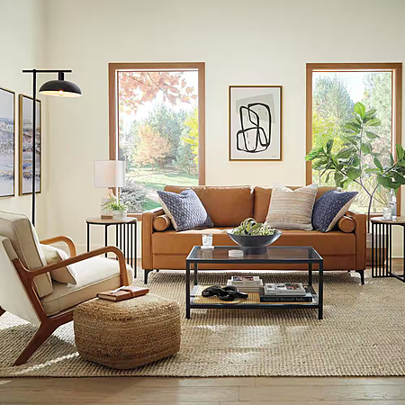 Rectangular design and squared-arms offer a sophisticated, mid-century modern feel