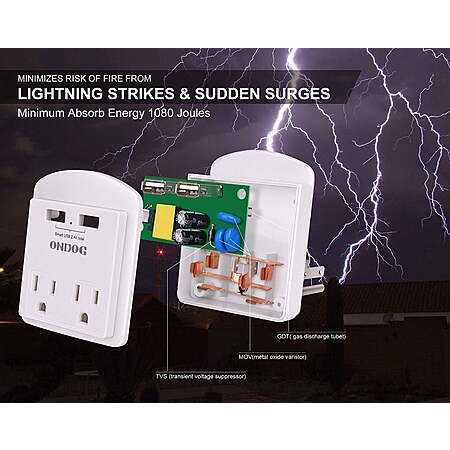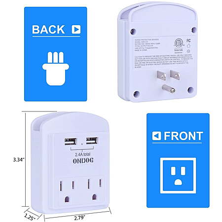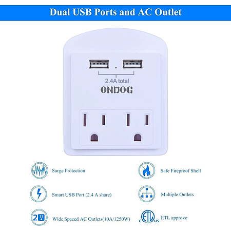 | Product Description: | ONDOG USB Wall Charger, Small Surge Protector,USB Outlet with 2 USB Ports (2.4A Total) and Top Phone Holder for Smart Phones, 1080Joules, White, ETL Certified ONDOG a brand dedicated to providing high-quality surge protectors and power strips has a professional technical team and a user-friendly service system to ensure safety and high-quality products and services. ONDOG's surge protectors&power strips are widely used in homes, offices, hotels and many other places. We gain the trust of our customers with high quality products and responsive services. ONDOG is worth your choice. Wall Outlet Extender - This wall socket with 2 grounded AC outlets plus 2 USB ports, with built-in a AC wall mounted surge protector(1080 Joules), for cell-phone, laptops and many other devices. Portable Travel Charger - The portable surge protector with usb ports is small, small and convenient. And had a wide spacing between outlets and USB ports allow you to charge up to 4 devices simultaneously, it will provide you with great convenience. Dual Smart USB Charging Ports - 2 Smart USB Charging Ports(Total 5V/2.4A), smart USB ports automatically detect charging devices and deliver optimal charging speed, USB-A Max to 2.4A per port. Also your cell phone could be put on the top phone holder conveniently when charging. Professional Surge Protector - Circuit POWRUI 3-level complementary Surge Protector Circuit, TVS(transient voltage suppressor)+MOV(metal oxide varistor)+GDT(gas discharge tube), and minimum energy-absorbing capacity of 1080 Joules. It truly provides great protection of your plugged-in devices. Our After Sale Service - ETL Certified, Our friendly and reliable customer service will respond to you within 24 hours. You can purchase with confidence, with our 30-day return and 12-month replacement |