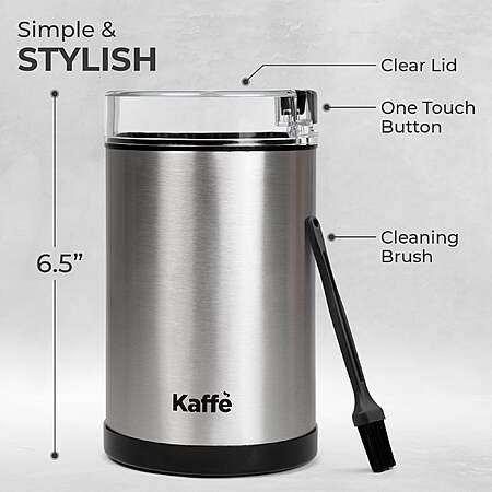 | Product Description: | The Kaffe line of electric coffee grinders provide a quick and efficient way to grind coffee beans or spices down to your desired preference for use with a french press coffee maker or coffee dripper set. Grinding coffee beans immediately before use releases fragrant essential oils at the right moment to ensure maximum freshness, rich aroma for a full-bodied flavor and complex, satisfying coffee with the most delicious taste from the comfort of your own kitchen. If you choose to grind beans to store, this is one of the best coffee grinders for doing so due to its quiet operation you will never wake anyone up while grinding beans! We recommend grinding just enough beans for each use though, as this makes for the freshest coffee. This coffee bean and spice grinder has a capacity of up to 2.5 ounces of coffee beans (70g) at a time, delivering the correct amount of coffee grounds to use for home or travel coffee dripper sets, you surely don’t have to worry about waking anyone up to make a cup of your favorite coffee. With its stainless steel blades, this electric grinder delivers coffee grounds to your preferred level of coarseness or fineness at the touch of an ON/OFF button. Thanks to a transparent lid, you can see the grinder at work and monitor your ground consistency. This compact appliance is easy to clean: Simply wipe parts with a damp, soapy sponge. Use the included cleaning brush to clean the inside of the grinder and leave no mess! The dishwasher-safe lid can be washed on the top shelf of your dishwasher. An attractive finish adds elegance to your kitchen. The perfect gift for him/her or any coffee lover as a wonderful kitchen accessory for those who love convenience at their fingertips. For your safety: the grinder only operates once you’ve secured the lid. ☕️ FRESH COFFEE EVERY TIME - Ensure maximum freshness and rich aroma by grinding coffee beans immediately before use, releasing the coffee beans' fragrant essential oils. Professional coffee in the comfort of your own home. 🌎 FOR ALL BREWING METHODS - By simply pressing the ON/OFF button and looking through the clear lid, you can achieve coarse or fine coffee powder for french press, cold brew, pour over, moka, espresso, or drip coffee makers. 💢 POWER IN POCKET SIZE - This compact small electric coffee grinder boasts a 3 oz capacity, 304 stainless steel blades, and a powerful 150W motor. Includes a CLEANING BRUSH for cleaning your coffee bean grinder. 🌿 SPICE, HERB, GRAIN, AND NUT GRINDER - Kaffe is not only about a perfect coffee grind. You can confidently use it as a spice grinder for herbs, nuts and grains. 💯 LIFETIME MANUFACTURER'S WARRANTY - We offer a lifetime manufacturer's warranty for all Kaffe espresso grinders. Having problems with your coffee grinder? Contact us via Amazon for a full refund or replacement. |