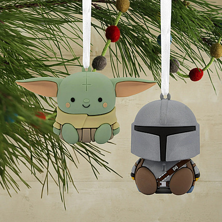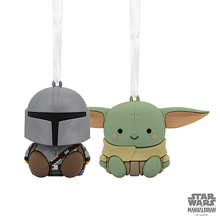 • Iconic Characters: Features stylized designs of The Mandalorian and Grogu, popular characters from the Disney+ original series "Star Wars: The Mandalorian," presented as a pair of Christmas tree ornaments.