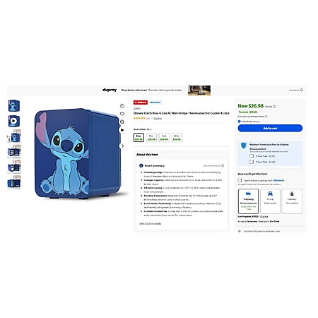 Disney Stitch Blue 6 Can AC Mini Fridge Thermoelectric Cooler 4 Litre [walmart.com]