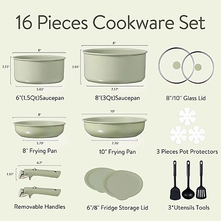 Carote 16-Piece Ceramic Nonstick Cookware Set, Pots and Pans Set with Detachable Handle, Induction Compatible, Oven & Dishwasher Safe, Sage Green $49.99