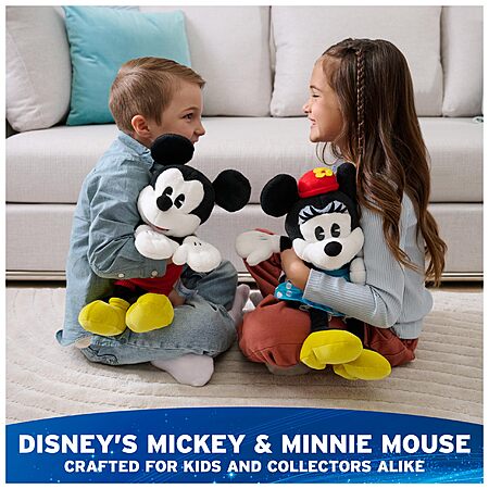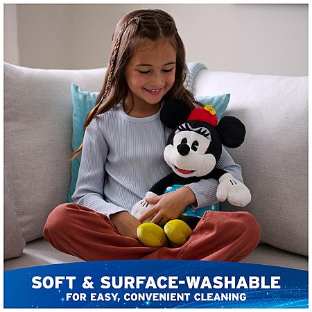 Deluxe Minnie Mouse Plush: This soft 14" plush shows Disney's Minnie Mouse, Mickey Mouse's sweetheart, dressed in deluxe fabrics including a blue polka-dot satin skirt, yellow velvet heels, lace-detailed bloomers, and an adorable red felt cap adorned with a yellow flower