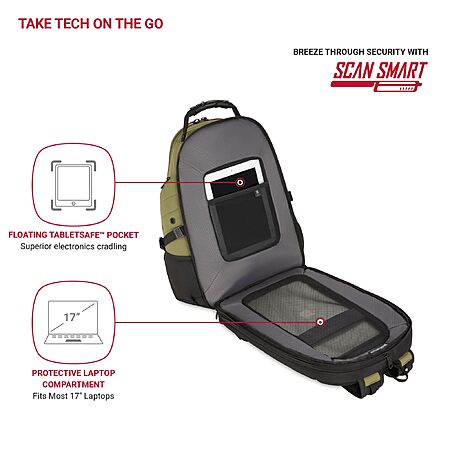 - 17-Inch Laptop Backpack: Pack all your gear and then some with a padded, TSA-friendly SmartScan tech compartment that fits a 17" laptop and an 10" tablet and lays flat through airport security and an impressive array of integrated organizers that keep essential pens, electronic accessories and more within reach