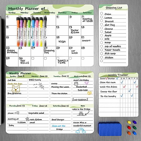 - Sturdy Markless Packaging: monthly planner (16.3" x 11.7"), weekly planner (16.3" x 11.7"), checklist (5.5" x 11.7"), weekly tracker (7.5" x 8.3"), 8 colored markers, 6 push pin magnets, and an eraser. All are magnetic and suitable for most refrigerators and smooth metal surfaces