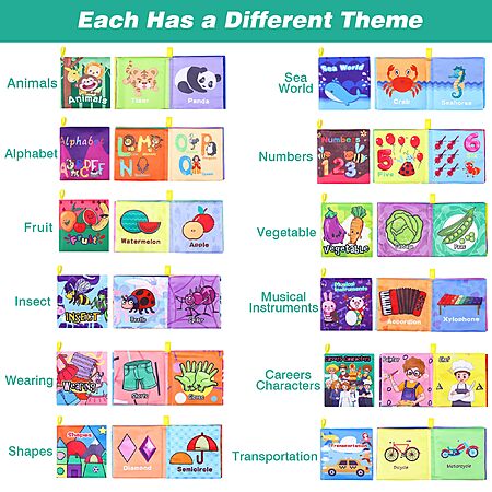 - Multiple Themes Baby Shower Book: The new 12 pack books are well-designed with vivid illustrations and colors, perfect for infants to toddlers to enjoy. 12 Different theme: Alphabet, Numbers, Shapes, Fruit, Vegetable, Animals, Sea World, Insect, Wearing, Careers Characters, Transportation, Musical Instrument.