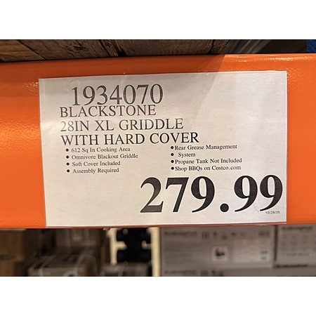 My Costco is selling the 28" XL Blackstone with folding shelves, three burners, and fabric cover for $279.99.