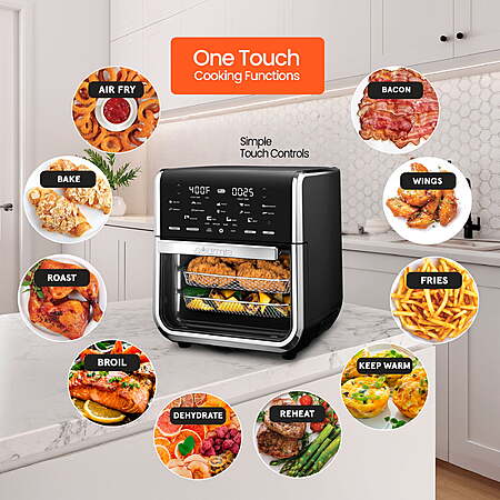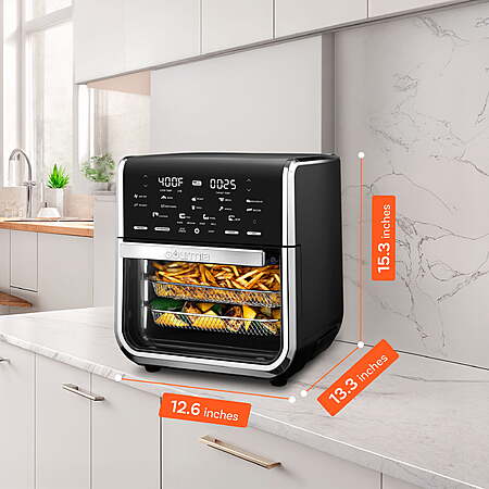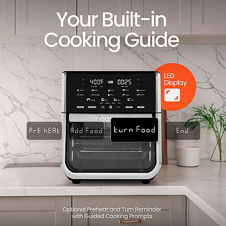 | Product Description: | Cook smarter and faster with the Gourmia All-in-One 14-Quart Air Fryer, Oven, Rotisserie & Dehydrator. With 28 one-touch cooking presets, it's easy to air fry, bake, roast, dehydrate, and more—perfect for busy families or entertaining guests. The large 14-qt capacity fits everything from weeknight meals to full rotisserie chickens. Powered by FryForce 360° Technology™, your food cooks evenly and comes out crispy every time. Use the integrated temperature probe and protein presets to get perfect results with meat, fish, and poultry. Extra features like preheat, Turn Food reminders, and Guided Cooking Prompts make every step simple and stress-free. Includes a rotisserie spit, lift tool, and dishwasher-safe accessories for easy cleanup. Whether you're air frying for one or feeding a crowd, this multifunction air fryer oven does it all—fast, easy, and delicious. Extra-large 14-quart capacity can satisfy a crowd with room to spare FryForce 360° Technology™ circulates heated air evenly for crispy perfection 28 Cooking Presets can be used with cook time or with probe One-Touch Protein Presets cook proteins to their ideal internal temperatures Integrated temperature probe delivers perfect doneness with ease Large viewing window and interior light to monitor cooking at a glance An optional preheat and Turn Food reminder, depending on your preference Guided Cooking Prompts offer helpful display messages and alerts Includes: 2 Air Fry Baskets, Rotisserie Spit, Rotisserie Lift Tool, and Drip Tray Dishwasher-safe accessories for quick and easy cleanup Gourmia |