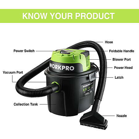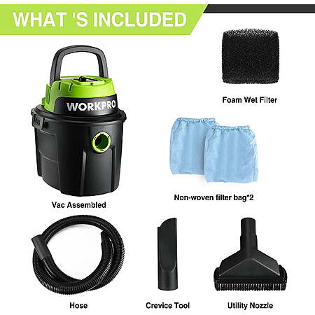 | Product Description: | The WORKPRO Wet Dry Vacuum offers powerful 3 peak horsepower suction in a lightweight, portable design with a 2.5-gallon capacity. Ideal for home, garage, and jobsite use, it features multi-function dry, wet, and blowing capabilities to handle dust, debris, and wet messes efficiently. Equipped with a 10-foot cleaning reach including hose and power cord, plus essential accessories like crevice tool and foam wet filter, this vacuum ensures thorough cleanup with ease and convenience. 3 peak horsepower motor for strong suction power 2.5-gallon tank for compact and lightweight design Includes over 10 feet of cleaning reach with hose, nozzle, and power cord Comes with crevice tool, utility nozzle, foam wet filter, and non-woven filter bags Foldable handle for easy transport and storage Ideal for cleaning hard floors, vehicles, garages, and patios |