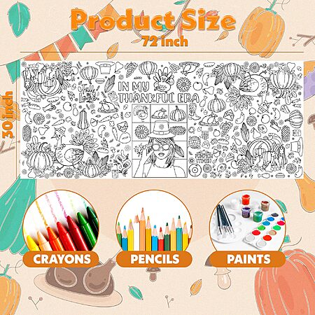 - [Dependable Quality]: Thanksgiving Party Decorations: 30 x 72 inch. This activity tablecloth is crafted from thick paper, ensuring reliability. The printing is distinct, and it resists breaking, tearing, and fading, offering you a satisfying usage encounter. Coloring- themed items.