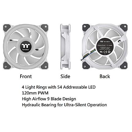 Riing Quad RGB is the first 4-ring design case fan with 54 LEDs all at the front side, supporting NeonMaker light editing Software and TT RGB PLUS. The fan itself utilizes a PWM controlled high-static pressure fan, long-life hydraulic bearing and compression fan blade design, delivering remarkable cooling performance without sacrificing quiet operation.