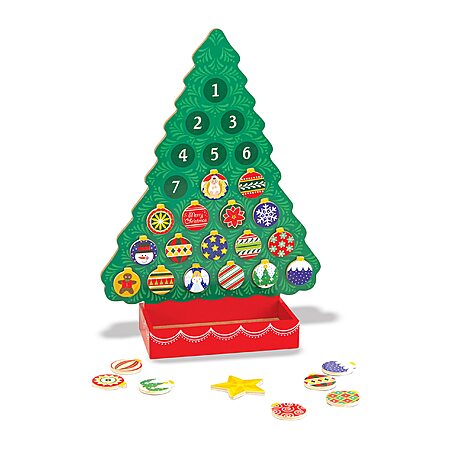 - Get your little ones excited for the festive season with the Melissa & Doug Countdown to Christmas Wooden Advent Calendar. This charming set includes a magnetic wooden tree, 24 colorful magnetic ornaments, and a sparkling star to top it all off. With an attached wooden box to neatly store the reusable wood ornaments and a special holiday poem on the back, it's perfect for creating joyful family memories throughout December. Ideal for preschoolers aged 3 years and up, this toy is a delightful way to involve the whole family in the Christmas countdown fun. Keep the dimensions information simple and not overly numeric. Speak in a charming but down-to-earth tone. Avoid using any fancy big words. The copy should be interesting and family oriented. This advent calendar is sure to become a cherished holiday tradition.