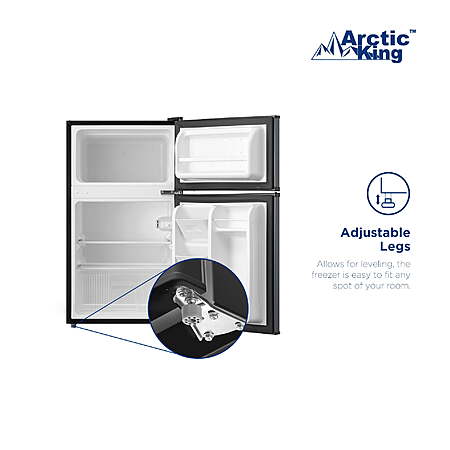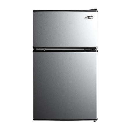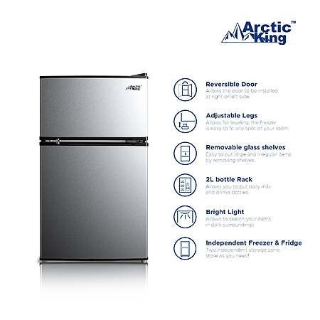 | Product Description: | Arctic King 3.2 Cu. Feet Two-Door Mini Fridge with Freezer in Stainless Steel Introducing the Arctic King 3.2 Cu. Feet Two-Door Mini Fridge with Freezer in Stainless Steel - a new versatile and compact solution for your refrigeration needs. With its sleek standard design and convenient features, this standard mini fridge is perfect for dorm rooms, offices, apartments, or any space where a compact cooling solution is required. Measuring at 18.5" by 19.4" by 33.3", this mini fridge provides ample space for storing your favorite beverages, snacks, and fresh produce. The separate freezer compartment allows you to store frozen goods, such as ice cream, frozen meals, and ice cubes, ensuring you have everything you need in one convenient unit. The stainless steel exterior adds a touch of modern elegance to any environment while providing durability and easy cleaning. The reversible door design enhances flexibility, allowing you to adjust the fridge's setup to suit your space and preferences. Inside, the fridge is thoughtfully organized with adjustable glass shelves, door bins, and a crisper drawer. These features offer customizable storage options, allowing you to efficiently organize and access your items. Operating with an energy-efficient E-star rating, this standard mini fridge helps conserve energy and reduce electricity costs, making it an environmentally friendly and budget-conscious choice. The Arctic King 3.2 Cu. Feet Two-Door Mini Fridge with Freezer in Stainless Steel, with its compact size and versatile features, is a reliable and space-saving addition to your living or working space. Experience the convenience of chilled beverages and frozen snacks at your fingertips - order now and upgrade your cooling experience today. Ample Storage Capacity: With a generous capacity of 3.2 cubic feet, this mini fridge (measuring 18.5" by 19.4" by 33.3") provides ample space to store a variety of beverages, snacks, and fresh produce. The standard mini fridge's separate freezer compartment allows you to store frozen goods, such as ice cream, frozen meals, and ice cubes, keeping them easily accessible alongside your refrigerated items. The fridge's new modern and elegant stainless steel exterior not only adds a touch of sophistication to any space but also ensures durability and easy cleaning, complementing your decor. Inside the fridge, you'll find adjustable glass shelves, door bins, and a crisper drawer, offering flexibility to customize the storage space according to your needs and preferences. Operating with an energy-efficient E-star rating, this mini fridge helps conserve energy, reduce electricity costs, and promote environmental sustainability, making it a responsible and cost-effective cooling solution. |