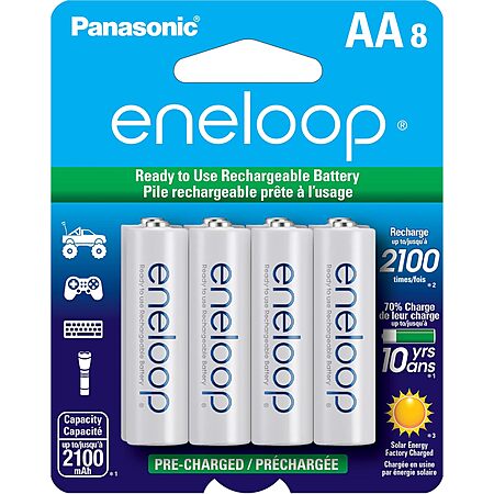 - eneloop AA rechargeable batteries are pre-charged at the factory using solar power and maintain up to 70% of their charge after 10 years (when not it use)