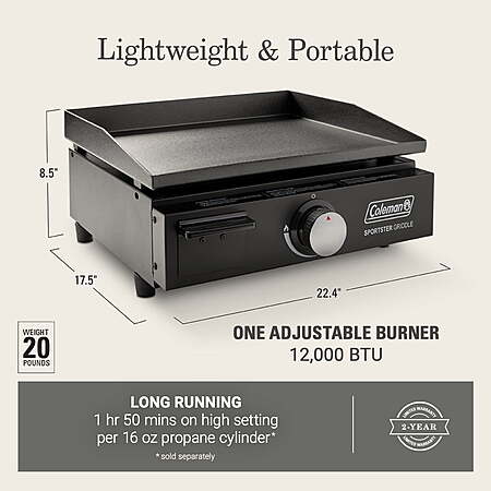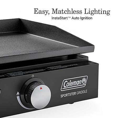 Ultra portable for gourmet cooking at tailgates, camping, and more Smooth cooking surface can cook up to 11 hamburgers at once on a 17-inch rolled carbon pre-seasoned griddle cooktop with 12,000 BTUs of power One optimized heat zone from perimeter burner Instastartâ„¢ Ignition offers automatic, matchless lighting Easy-cleaning smooth surface plus a removable grease tray Legs are adjustable for stability on uneven surfaces 2-year limited warranty Uses propane fuel