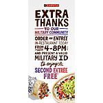 *The BUY-ONE-GET-ONE (BOGO) offer is limited to five free entrée items per check; each free item requires purchase of an entrée item of equal or greater value and may be collected only by the customer holding the military ID. Valid only on Tuesday, November 11, 2025 from 4:00 p.m. to 8:00 p.m. local time. Presentation of valid government-issued military ID required. Redeemable in-restaurant only, at participating U.S. locations; redemption is subject to availability. Not valid for catering, mobile, online or delivery orders. Kids' meals do not count as an entrée purchase. Purchased entrées are eligible for Chipotle Rewards points; the offer may not otherwise be combined with other coupons, promotions, or special offers. Additional restrictions may apply; void where prohibited.