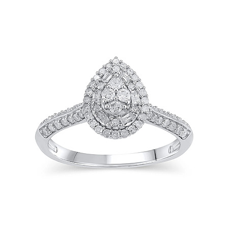 - Design Features: Pear-shaped composite center, inner frame with round and baguette-cut diamonds, and outer halo lined with round diamonds