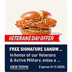 I ordered second one for curbside on another phone. It had full receipt it says Zaxby App Discount nothing about veterans day on receipt. They don't know if you are using reward points to get Free Sandwich.