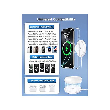 Designed to work seamlessly with a wide range of models, including iPhone 17, 17 Pro, 17 Pro Max, Air, 16, 16 Pro, 16 Pro Max, 16 Plus, 15, 15 Pro, 15 Pro Max, 15 Plus, 14, 14 Pro, 14 Pro Max, 14 Plus, 13, 13 Pro, 13 Pro Max, 13 mini, 12, 12 Pro, 12 Pro Max, 12 mini, 8 and above ( paired with magnetic case or ring), AirPods Pro4/Pro2/2/3/4 (Pro 2/3/4 requires wireless charging case)