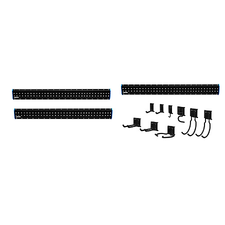 - Includes: (3) 35" Steel Rails, Mounting Hardware, (1) Power Tool Hook, (2) Large J Hooks, (2) Double Hooks, (1) S Hook, (2) Single Hooks, (1) J Hook, and (6) Endcaps and Operator's Manual