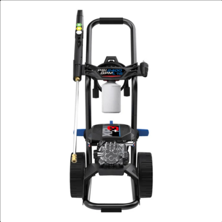 The AR Blue Clean XP3-2400 Electric Pressure Washer delivers up to 2400 PSI and 1.16 GPM, powered by a 14-amp induction motor and tri-axial pump. It includes premium accessories: an M22 trigger gun, an 18 inch metal lance, 25-ft hose, 25 ounce quick connect foam cannon, and four quick-connect nozzles. With a two-wheel trolley for mobility and onboard storage, it's designed for easy use. The Total Stop System extends pump life, and it's backed by a two-year limited warranty.