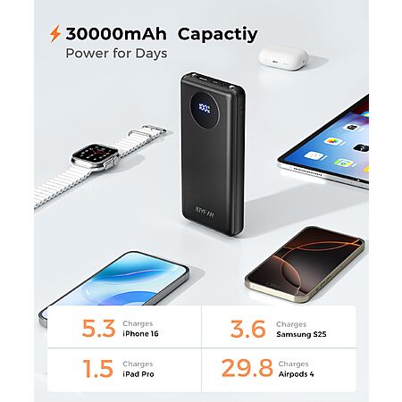 (NEW) 30,000mAh 22.5W Fast Charging Powerbank w/Built-in Cables $17.99