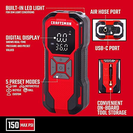 Craftsman 12V Portable Air Inflator Tool w/ Built-In LED Light/USB-C Port $24.98, free pickup, Lowe's