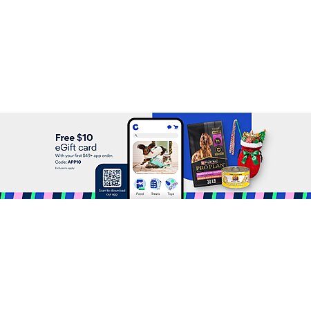 Chewy offers a free $10 gift card with your first $49+ order placed in the Chewy app when you apply code APP10. Shipping is free on orders $49+.