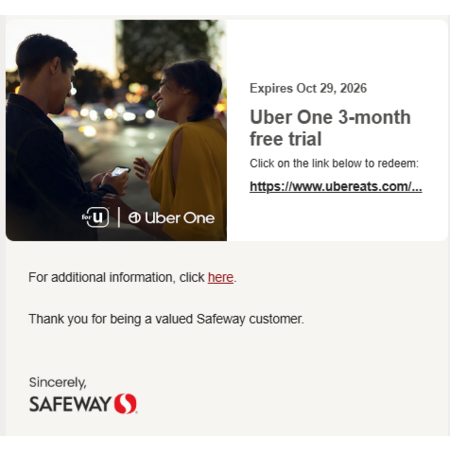 Free Uber Eats Uber One for 3 months by Safeway U members.