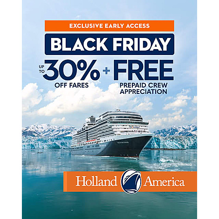 The Black Friday offer is combinable with Holland America Line's "Have it All" premium fare. When booking with Have It All, in addition to the Black Friday fare discounts, free prepaid crew appreciation, free and reduced third and fourth guests, and reduced deposits, guests receive four high-value amenities: shore excursions, specialty dining, Wi-Fi and a beverage package.